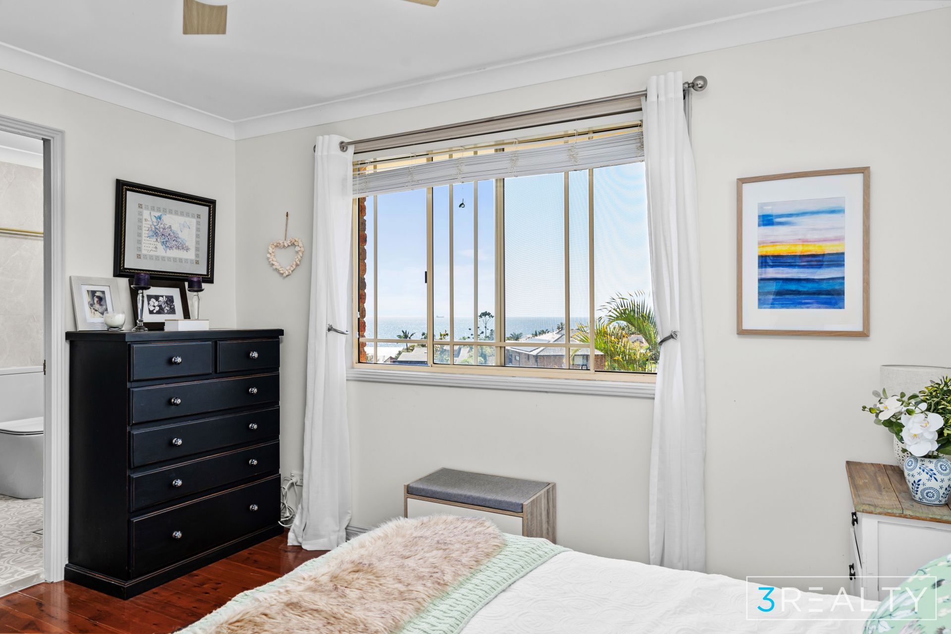 The home includes four well-sized bedrooms, each with built-in wardrobes. The master suite is a private retreat, offering sweeping ocean views, a walk-in robe, and a luxurious ensuite. The other three bedrooms are spacious, sharing a beautifully renovated family bathroom.