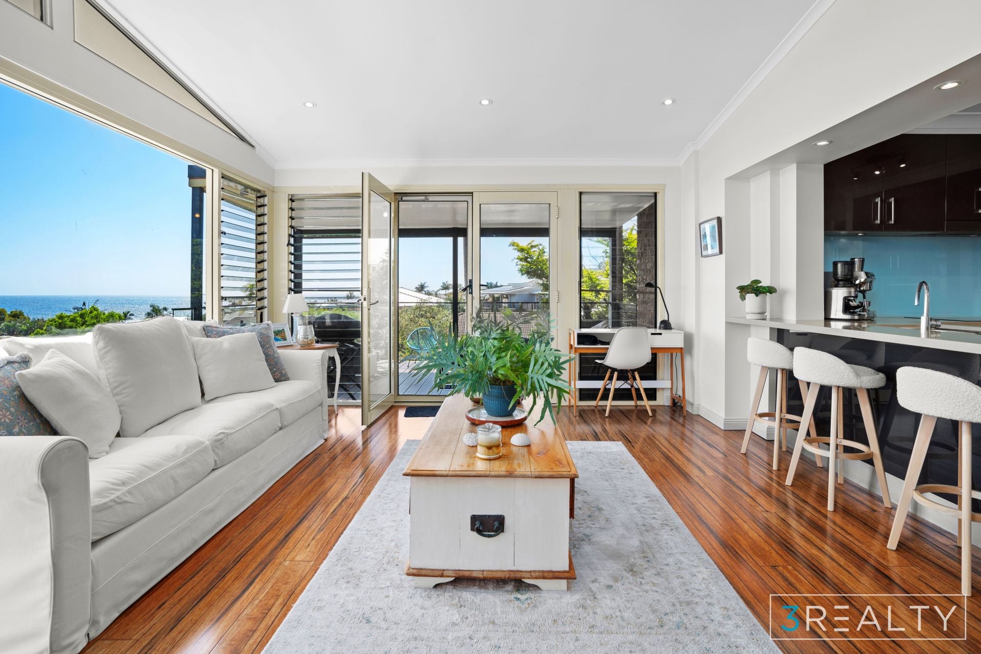 The kitchen is a highlight, featuring ample storage, a large island bench, and high-quality appliances. It opens onto the living and dining areas, ensuring that cooking and dining are always part of the social experience, with the added bonus of ocean views.