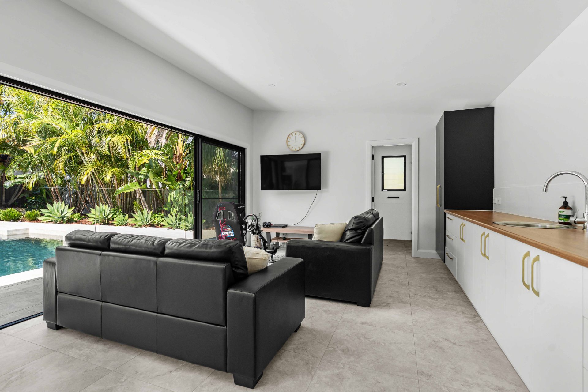 At the heart of the home, the bespoke kitchen is a statement in both form and function - premium finishes, custom joinery and seamless flow into open-plan living and entertaining zones. Oversized windows flood the interiors with natural light while drawing your eye to the stunning resort-style pool, creating a constant sense of calm and connection.