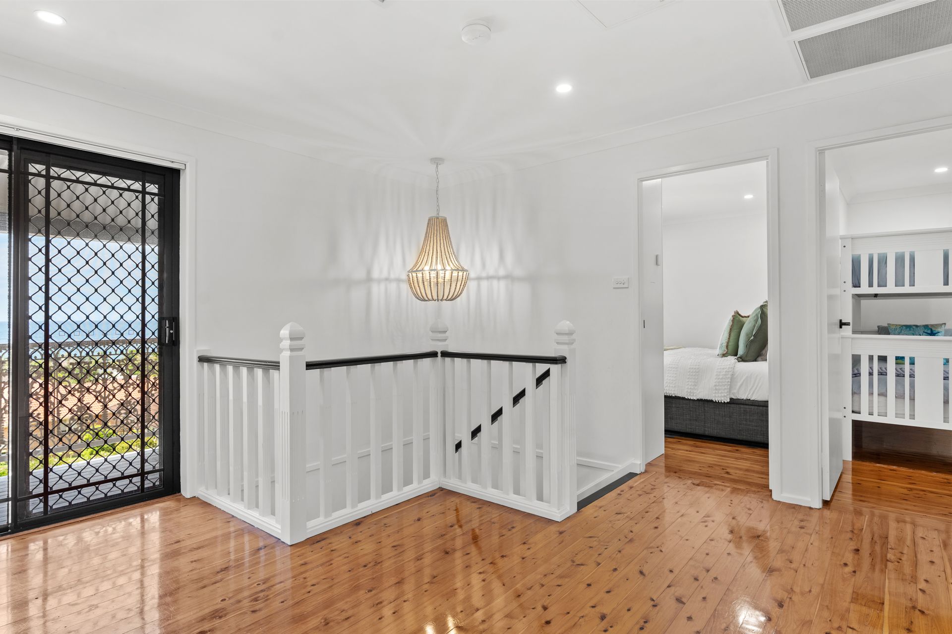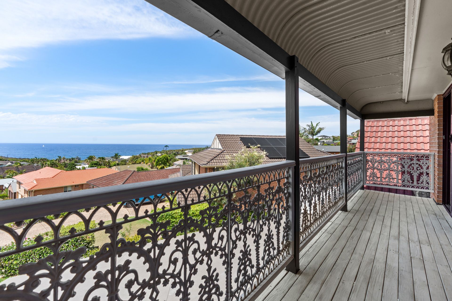Upstairs, the master retreat enjoys oversized windows framing uninterrupted ocean vistas, complete with a modern ensuite and wardrobe. Timber floors add warmth throughout, while the renovated main bathroom showcases a claw-foot bath, marble tiling and plantation shutters. Four additional bedrooms offer flexibility for family living, guests or short-stay accommodation.